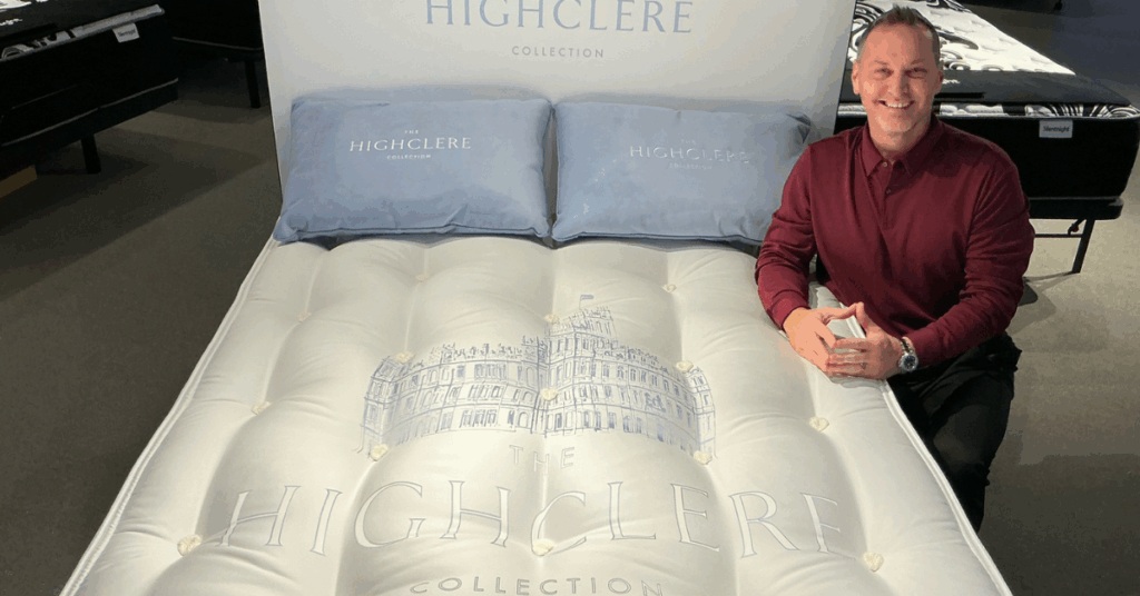 Adrian Wertz stands with a new tufted mattress in the Highclere Collection.