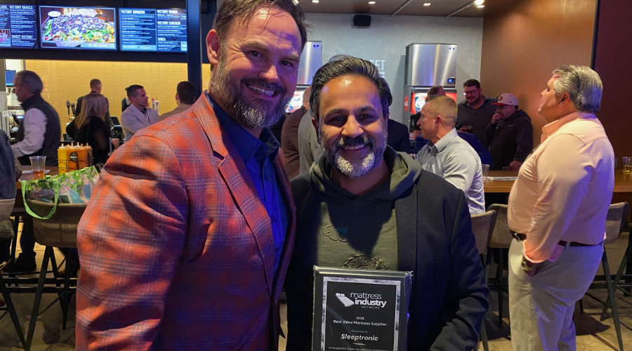 Greg Jent, MIDAS (left) and Riz Sunderji, Sleeptronic, holding the 2026 Mattress Industry Network Award for Best Value Mattress.