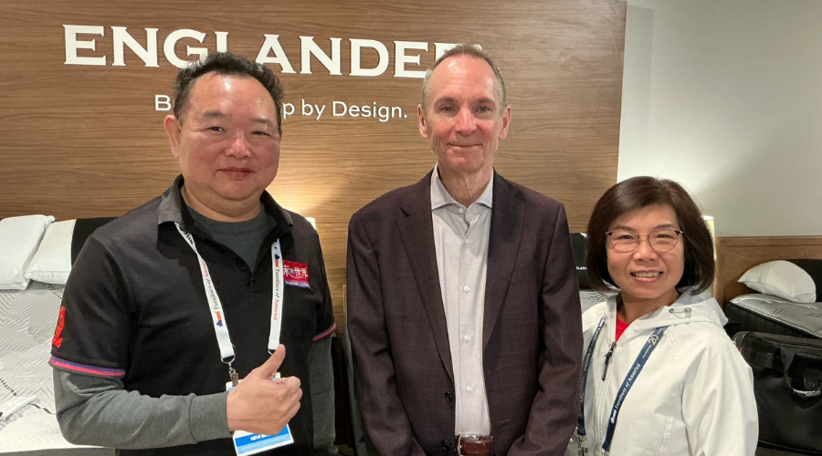 Jack Chen, left, Bedding World, Taiwan; Lou Paige, Englander; Debbie Lan, Shellton International, Taiwan.