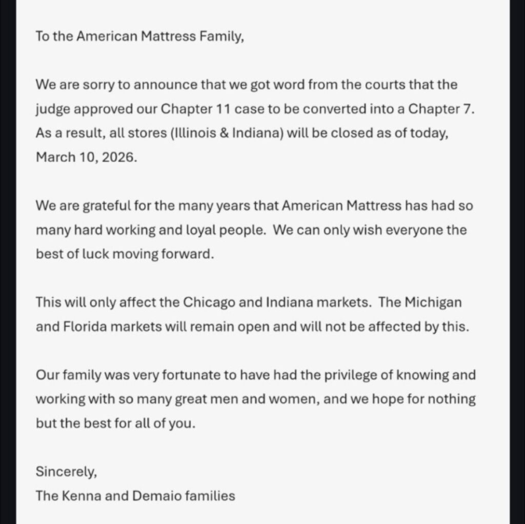 According to an email obtained by Bedding News Now from a close source, American Mattress has converted its Chapter 11 bankruptcy filing into a Chapter 7, often called “liquidation bankruptcy.” All American Mattress stores in Illinois and Indiana will be closed as of March 10, 2026.